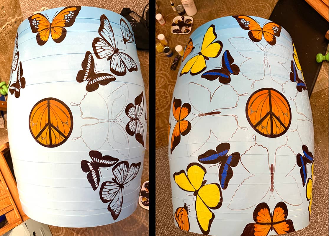 I'm making slow but steady progress on the wine barrel art. Butterflies everywhere!
