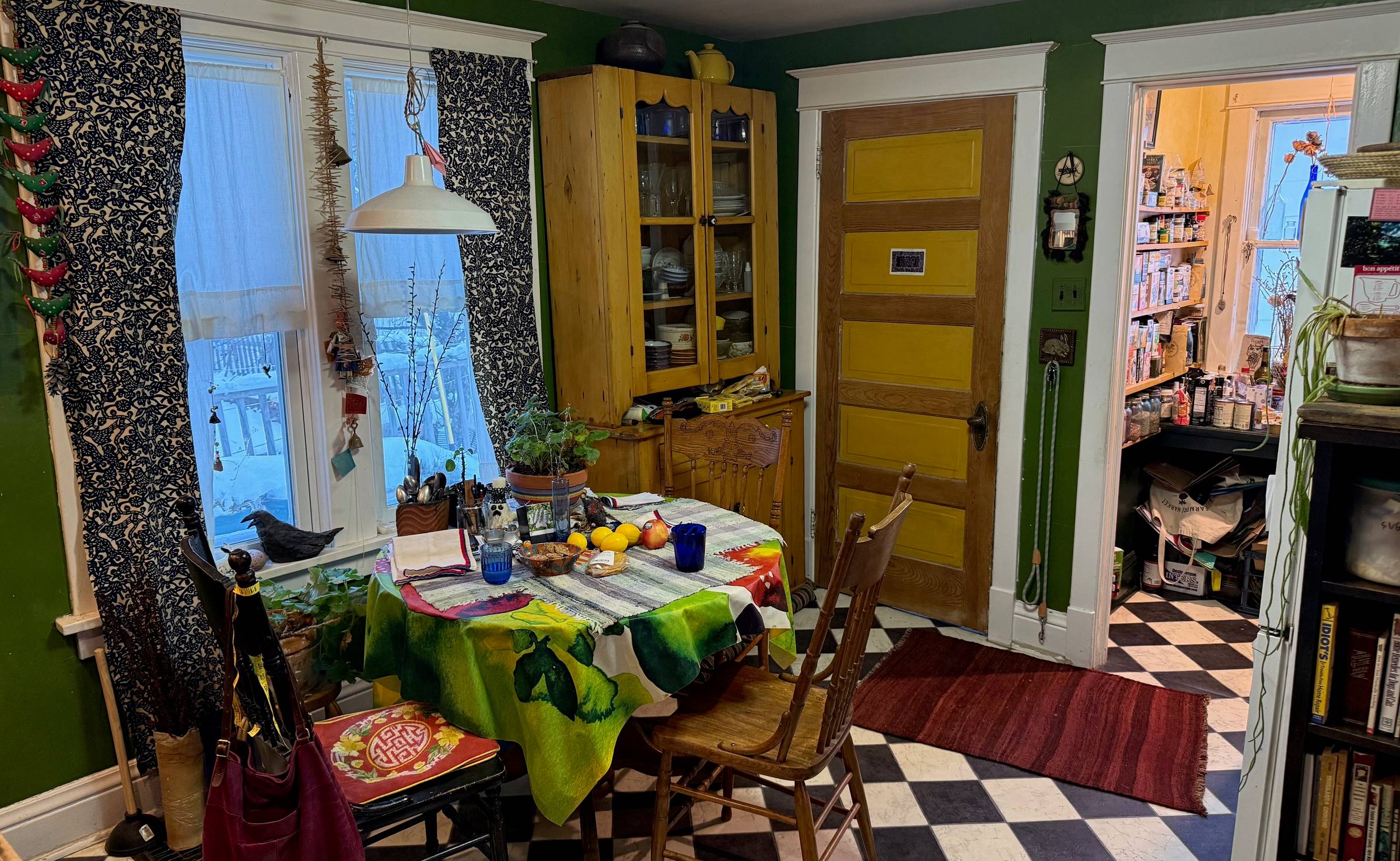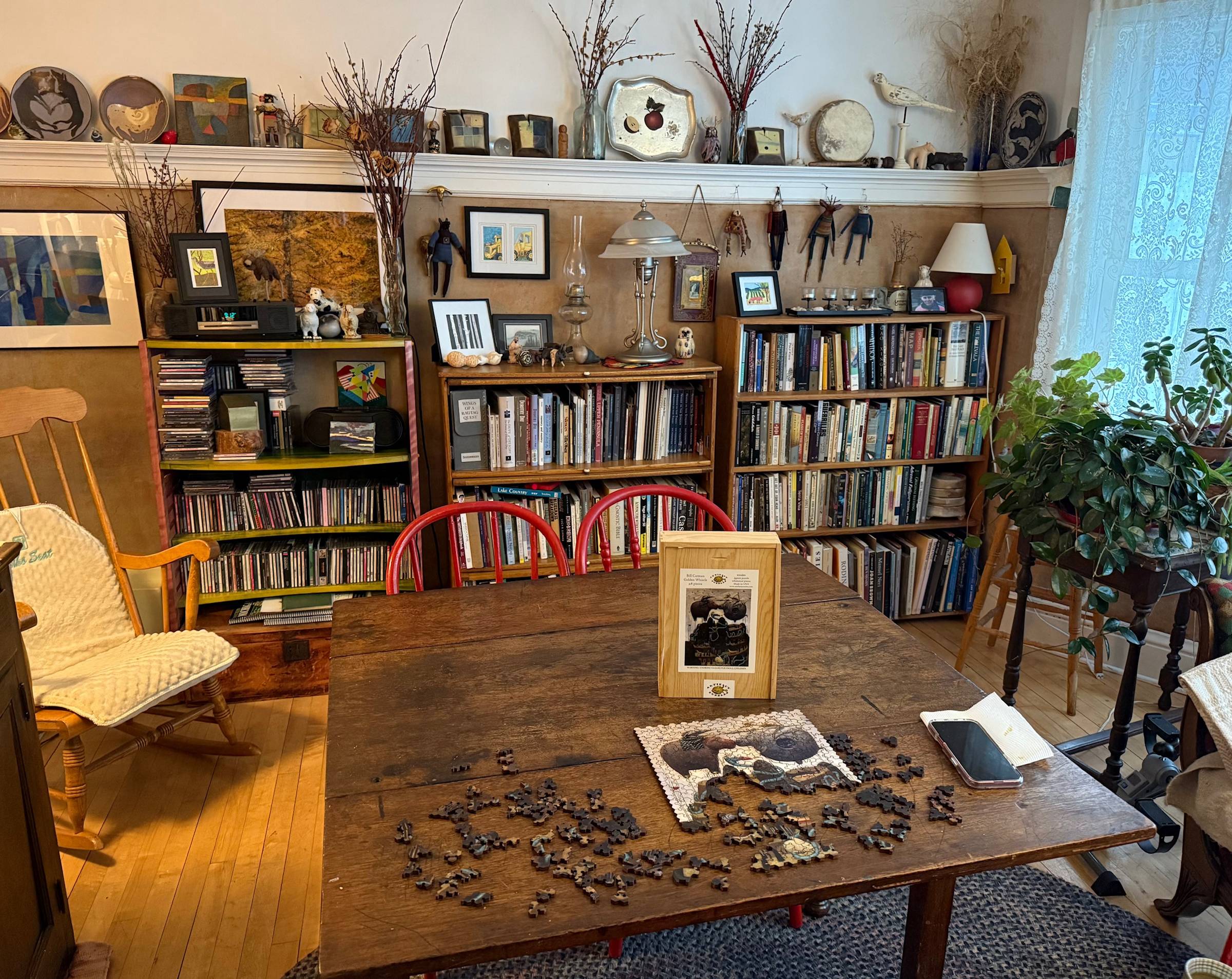 Take her dining room. This one wall holds so much life: figurines, plates, artworks, books and CDs, sculptures, plants, pussywillows, dolls, rocks, bones, feathers, instruments, candles, jars, lamps, prayer cards, Buddhas, pens and pencils, sewing supplies, and an old kerosene lantern.
