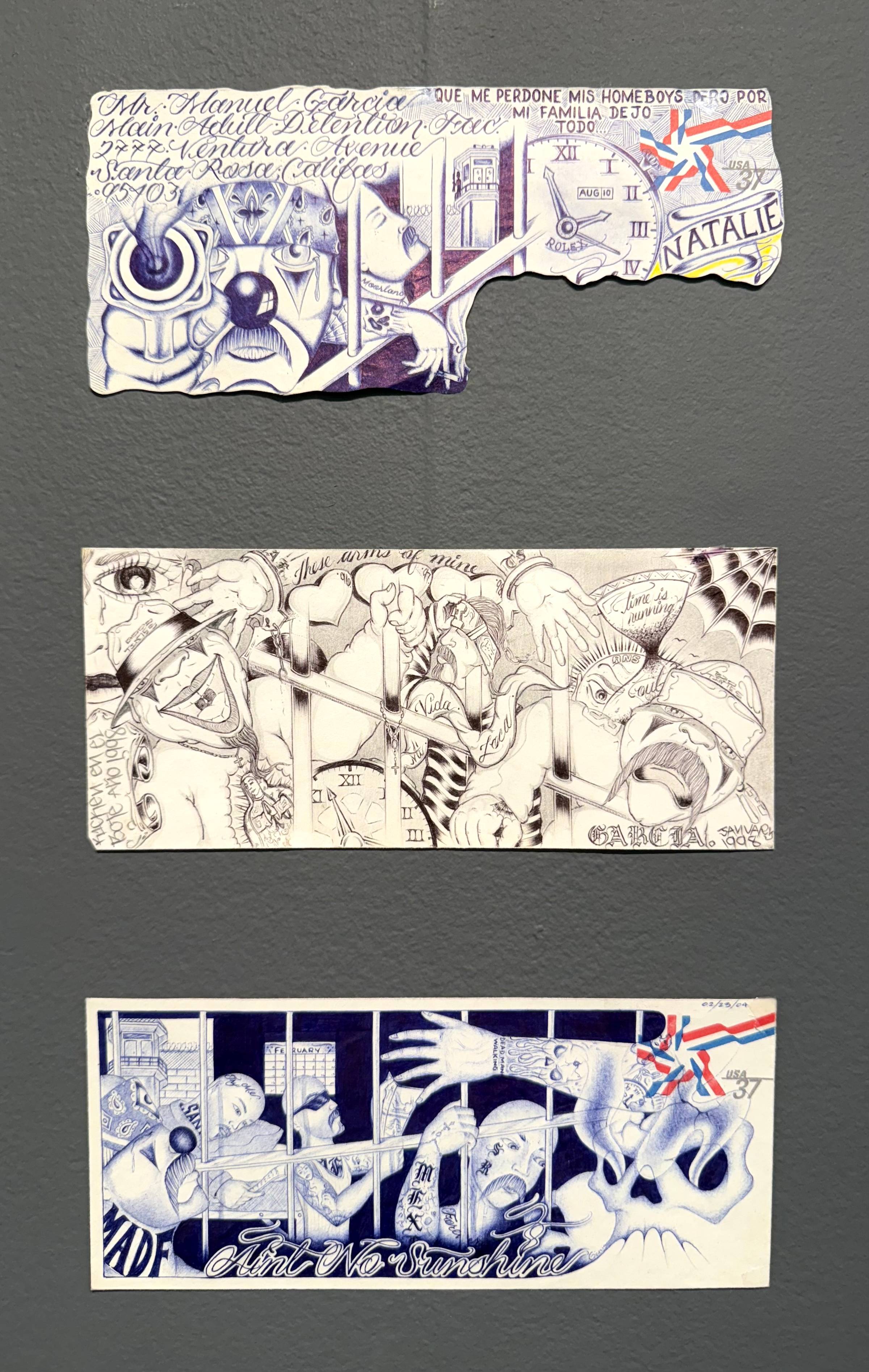 There's a wall of paños—or prison art. The artists used whatever pens or pencils they could get, and drew on envelopes, pads, scraps of paper. The recurring symbols include painted skulls, clocks (time passing), clowns and happy/sad masks (“Smile Now, Cry Later”), hummingbirds (messengers), La Virgin de Guadelupe, the Red Road, and more. The art was often used as currency, a way to trade for valued things.