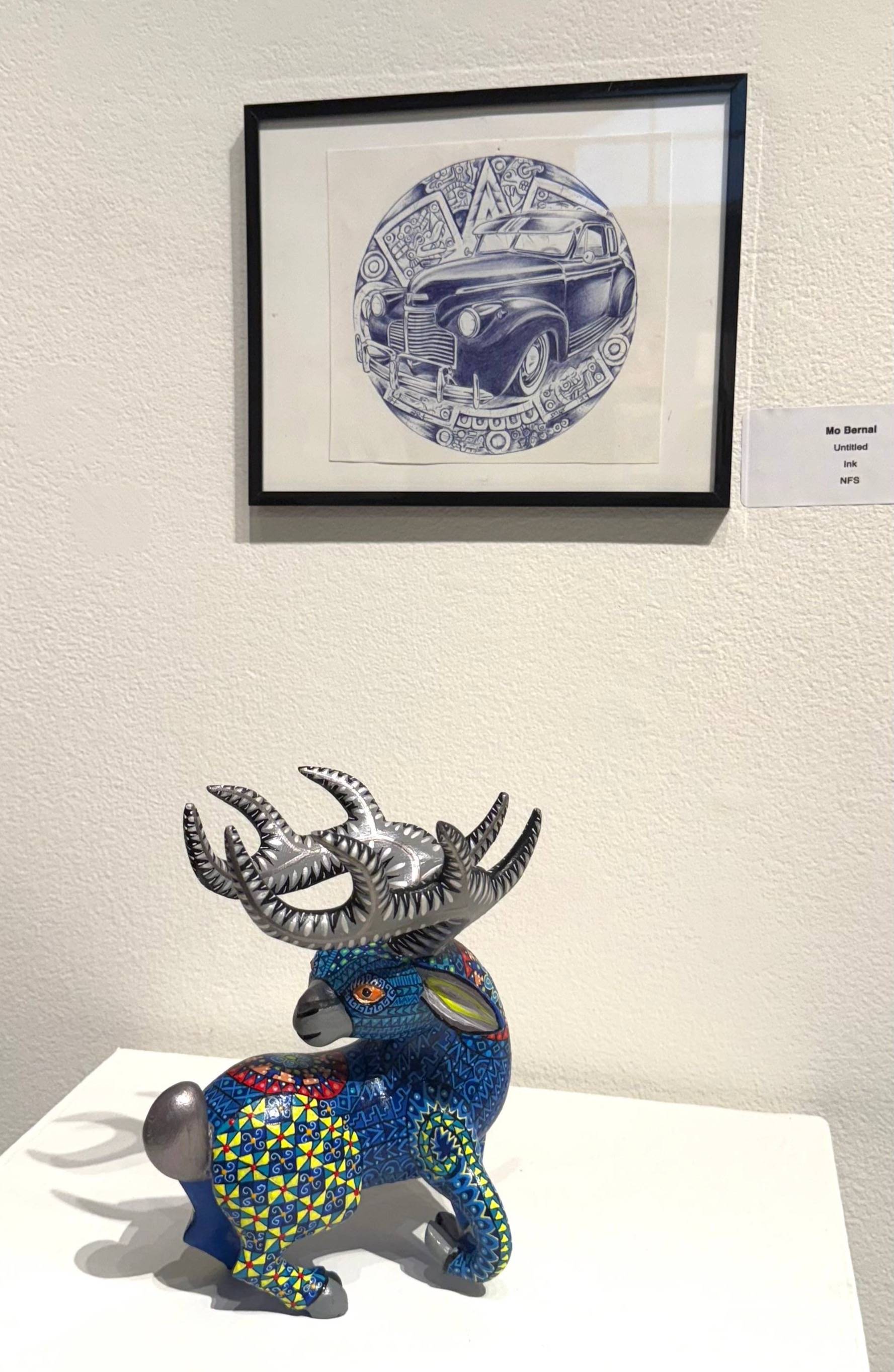 "Reindeer" by Irma Rodriguez, beneath a pen drawing by Mo Bernal.