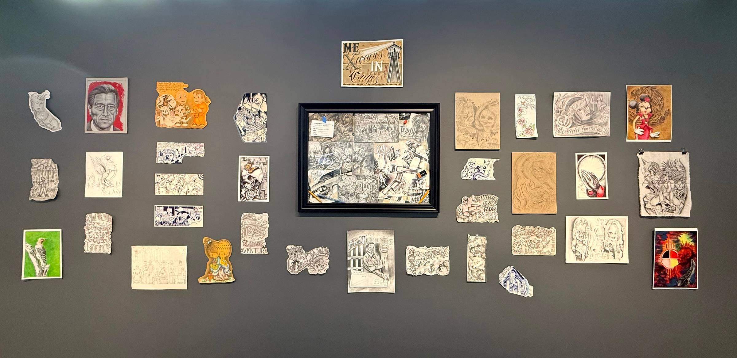 The artists who created paños for this exhibit credit artmaking with healing. They were pushed into “the life” as kids, when they were put into juvenile hall and youth authority for minor infractions in school. Having a record and being Latino made their roads more difficult as adults. But learning to draw and tattoo saved their lives and helped them make better choices.